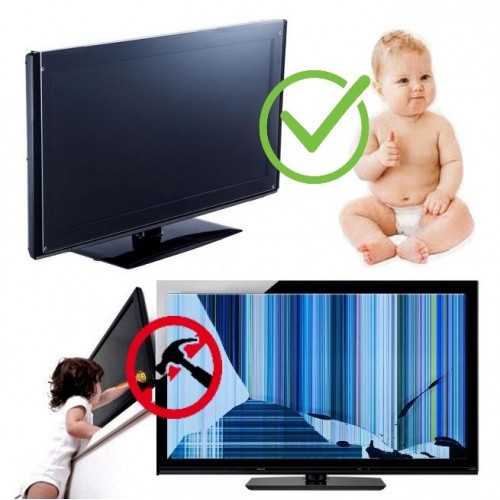 Istraživanja pokazuju da svaki treći kupljeni LCD/LED televizor zavriši sa upotrebom pre garantnog roka baš zbog loma LCD ekrana koji iznosi oko 80% cene celog televizora te ga oštećenje istog čini neisplativim za popravku. Dečija igra, rodjendani, kućne žurke, proslave, znatiželjni ljubimci, nepažnja prilikom čišćenja, ili prolivanje tečnosti su najčešći uzroci kvara ekrana Tv-a. Ovaj revolucionarni proizvod poštedeće Vas stresa i neplaniranih troškova kupovine novog televizora. Upitanju je zaštitno staklo od kaljenog, ultra providnog, plexi-klirita (debljine 2mm), koji je idelalno rešenje u vidu zaštite za veliki TV ekran. Ujedno je elasičan ali i ekstremno tvrd materijal što ga čini praktično ne lomljivim. Njegova ultra-transparentost propušta kristalno jasnu sliku, praktično je i neprimetan dok je TV ekran uključen, a njegov flat screen dizajn čini ga ravnom površinom koja pokriva i fabrički ram na ekranu što ga čini estetski lepšim i lakšim za održavanje/čišćenje. Jendostavan je za montažu zbog njegovog 90° zakrivljenja pri vrhu proizvoda kao i uz pomoć samolepljivih silikonskih i sundjerastih trakica koje se nalaze u uglovima proizvoda. Staklo poseduje UV filter i znatno smanjuje nivo UV zracenja ekrana!